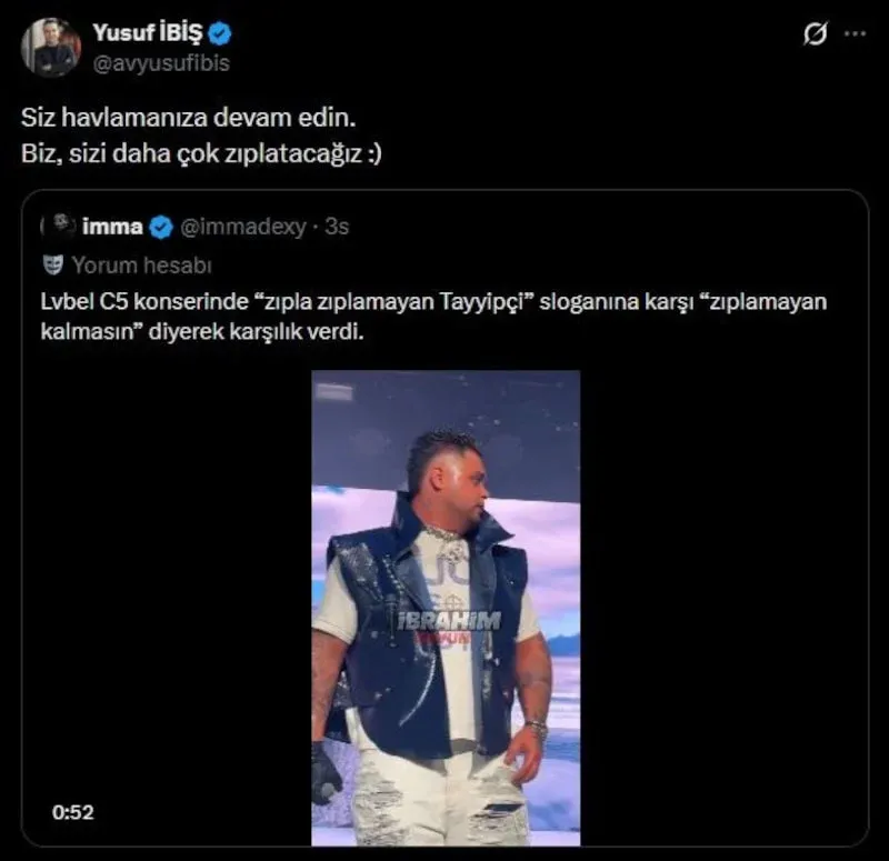 AK Parti Gençlik Kolları Başkanı Yusuf İbiş, söz konusu konser görüntülerini sosyal medya hesabından alıntılayarak bir paylaşımda bulundu. İbiş, paylaşımında "Siz havlamanıza devam edin. Biz, sizi daha çok zıplatacağız :)" ifadelerini kullandı.